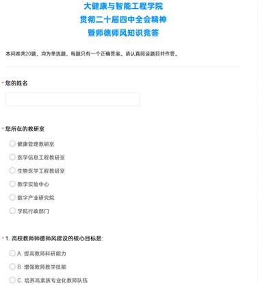 为深入学习并贯彻党的二十届四中全会精神,强化教师队伍的师德师风建设,营造优良的教育教学环境,大健康与智能工程学院工会于2025年11月18日至11月26日开展了党的二十届四中全会精神暨师德师风知识竞答活动。本次活动采用线上答题的形式,依托问卷星平台实施。